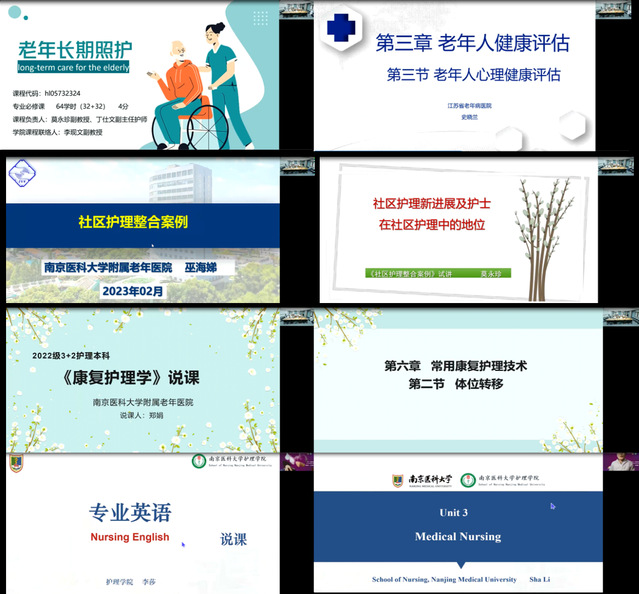 接着十门课程依次进行说课及试讲。附属江宁医院朱承玲、陈婷、乔明、徐洁艳、于芳、魏飞老师分别对护理教育学、护理管理学、中医护理学、临床护理整合案例、护理伦理学、传染病护理学等六门课程进行说课。附属老年医院莫永珍、史晓兰、巫海娣、郑娟老师及MK体育(中国)李莎老师分别对老年长期照护、社区护理整合案例、康复护理学、专业英语等四门课程进行说课及试讲。说课是针对整门课程,围绕教学分析、教学设计、教学过程、教学评价等方面展开,试讲是针对具体的一节课内容进行。会前,各教学基地认真组织试讲工作,十位老师结合上周集体备课的要求精心准备,先在课程小组试讲、后在医院层面演练,最后在这次学院层面的会议上展示。