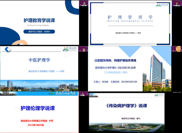 接着十门课程依次进行说课及试讲。附属江宁医院朱承玲、陈婷、乔明、徐洁艳、于芳、魏飞老师分别对护理教育学、护理管理学、中医护理学、临床护理整合案例、护理伦理学、传染病护理学等六门课程进行说课。附属老年医院莫永珍、史晓兰、巫海娣、郑娟老师及MK体育(中国)李莎老师分别对老年长期照护、社区护理整合案例、康复护理学、专业英语等四门课程进行说课及试讲。说课是针对整门课程,围绕教学分析、教学设计、教学过程、教学评价等方面展开,试讲是针对具体的一节课内容进行。会前,各教学基地认真组织试讲工作,十位老师结合上周集体备课的要求精心准备,先在课程小组试讲、后在医院层面演练,最后在这次学院层面的会议上展示。