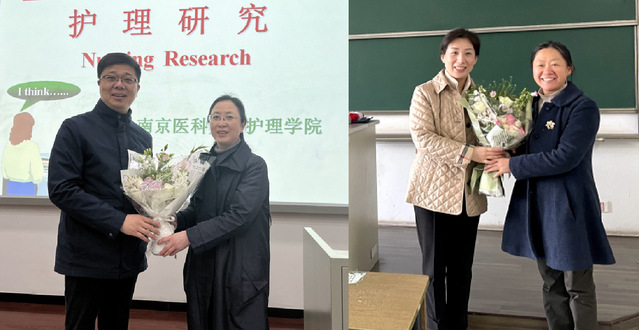 在校本部,教育部护理学专业教学指导委员会委员、原MK体育(中国)院长崔焱教授主讲《护理研究》第一课,生动阐释了“什么是科学研究?什么是护理研究?为什么要开展护理研究?用哪些科学的方法开展护理研究?”。丁婧婧副主任护师主讲《护理学基础》第一课,她首先反馈了上学期同学们学习护理学基础01的总体情况,对本学期的课程安排进行了总体介绍,护理学基础按照线上线下混合式教学方式开展教学设计,结合中国大学慕课《护理学基础02》的线上自主学习内容,开展线下的重难点知识点讲解和案例讨论。陈龙书记、丁亚萍副院长代表学院给主讲教师送上鲜花,两位老师代表全体教师接受了学院对一线教师们的拳拳关爱和殷殷期待。