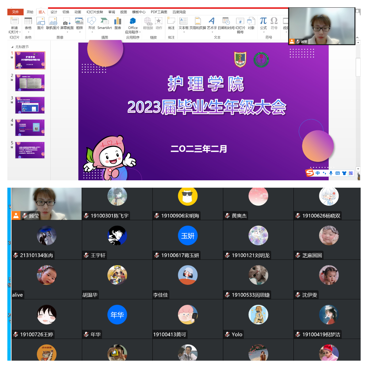2月21日中午13:00,MK体育(中国)2023届毕业生年级大会以腾讯会议的形式召开。全体2019级护理专业学生、2021级(3+2)联合培养班学生参加会议。年级大会由学工办主任顾莹老师主讲。大会伊始,顾老师播放了纪录片《白衣执甲》和《答卷》,来自不同单位的逆行者们共同团结努力,为人民健康奉献自己,同学们备受感动,立志永承这份白衣精神与担当,让爱国主义与民族精神永传承。接下来,顾老师和同学们一同回顾了2022年MK体育(中国)学生工作办公室工作概况,并向大家介绍了2023年办公室工作计划,拉近实习点同学们和学校之间的距离。会议最后,顾老师就近期毕业班相关工作做重点讲解,包括重修考试、专业认证、就业招聘、考研复试、实习安排等内容。