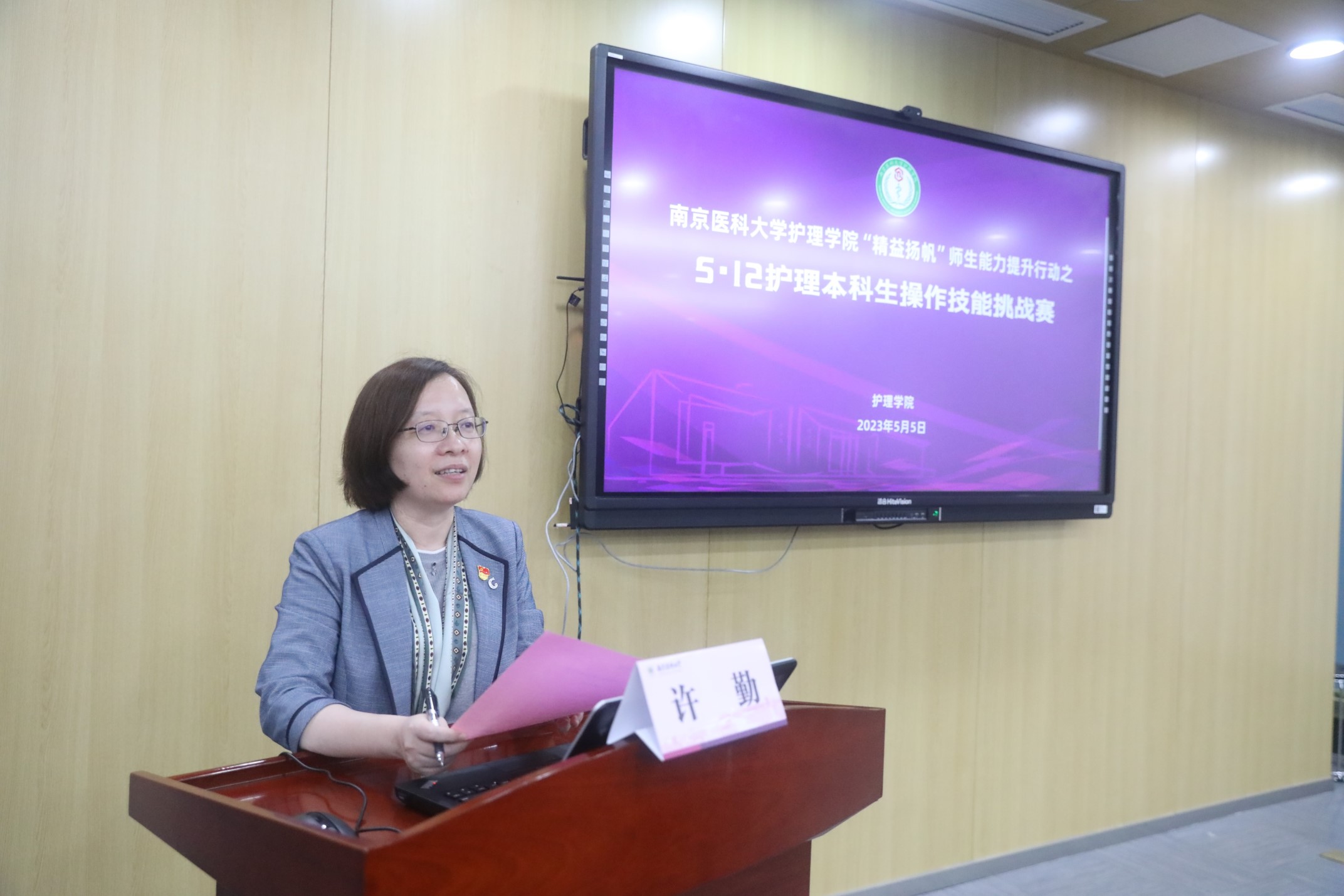 2023年5月5日18:30,mk体育在线官网举办了“精益扬帆”师生能力提升行动之5·12护理本科生操作技能挑战赛。南京医科大学教务处副处长、医学模拟教育中心副主任黄华,MK体育(中国)党总支书记陈龙,院长许勤,副书记、副院长苏益民,副院长丁亚萍,教师裁判,辅导员等老师以及参赛的29支2021级本科生参赛队伍出席了开幕式。