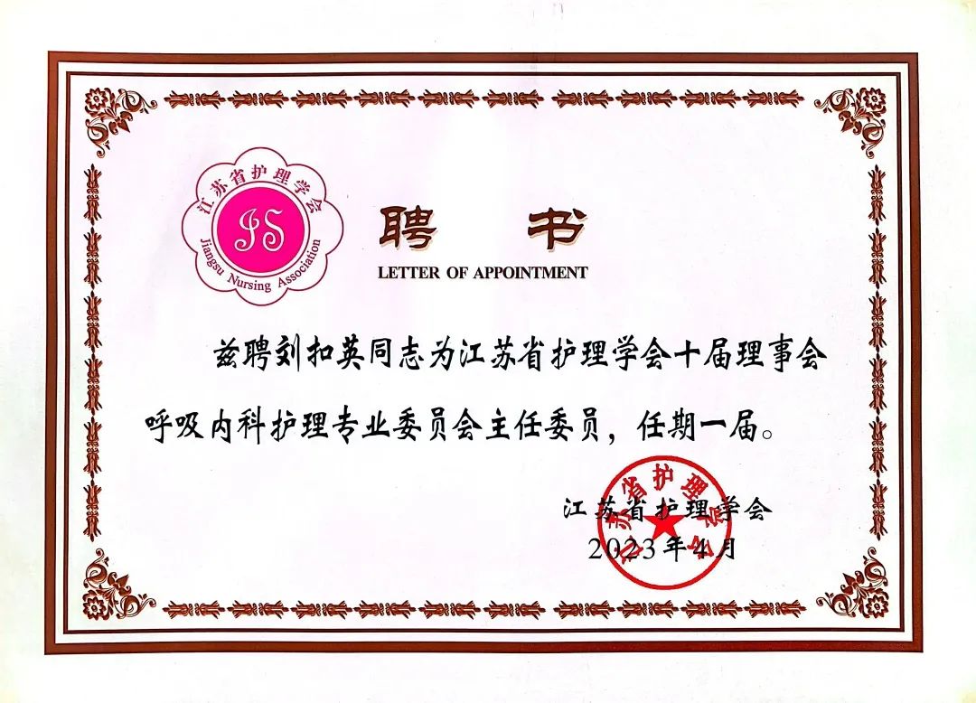 护士节前夕,在江苏省卫健委的支持下,省护理学会在全省范围内开展了江苏省“百名优秀护士”评选活动。经过层层筛选与角逐,在各市护理学会、省管医院上报的300名人选中,MK体育(中国)临床护理学系《内科护理学》课程负责人、一附院呼吸科与危重症医学科护士长刘扣英副教授荣获江苏省“百名优秀护士”荣誉称号。
