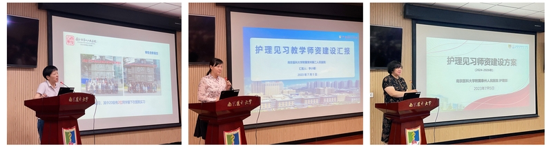 见习教学基地(含拟建)做双师型师资队伍建设汇报。附属无锡人民医院护理部主任曹晓东、附属苏州医院护理部主任蒋玲、附属淮安第一医院护理部主任张青、苏北人民医院教育培训处副处长顾志娥、镇江市第一人民医院护理部副主任庄利梅、附属常州第二人民医院临床护理教研室副主任李小娜、附属泰州人民医院护理部主任冯国琴先后围绕见习教学师资现况、建设目标、建设举措等方面汇报交流。