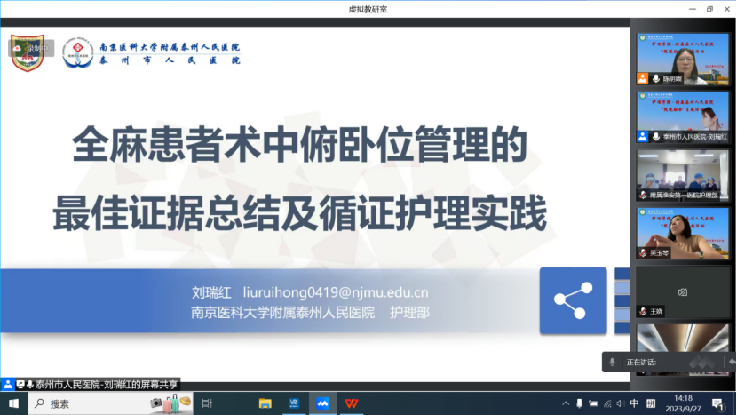 附属泰州人民医院刘瑞红老师作了“全麻患者术中俯卧位管理的最佳证据总结及循证护理实践”的主题分享。刘瑞红老师针对全麻俯卧位患者术中肌肉松弛,术中危险因素多等问题从证据总结、基线审查、障碍分析、证据应用、效果分析五方面进行了全面系统的汇报,为术中体位管理的临床工作提炼了最佳证据,开拓了新的思路。