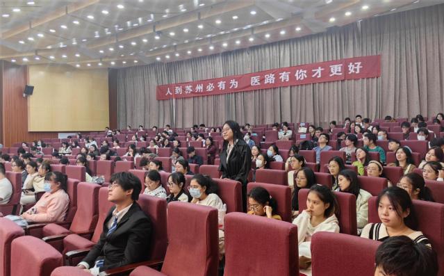11月5日,南京医科大学附属苏州医院在我校开展校园招聘“直通车”人才招聘计划,南京医科大学附属苏州医院护理部蒋玲主任展开宣讲,主要从苏州风貌、医院概况、护理概况、护理质量管理、护理学科建设、未来发展规划等方面进行介绍。她通过问答环节向同学们详细介绍了本次校园招聘“直通车”优惠政策,吸引了众多同学积极报名。经过面试考核,附属苏州医院一次性录用我院76名毕业生。