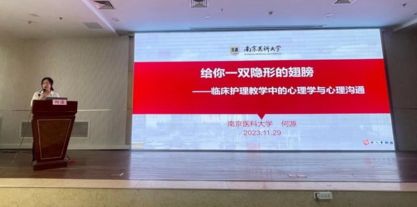 南京医科大学马克思主义学院何源教授以«给你一双隐形的翅膀-临床护理教学中的心理学和心里沟通»为题,阐述了如何将心理学的理论和技术应用于护理领域,研究护理对象及护士心理活动的规律及特点。