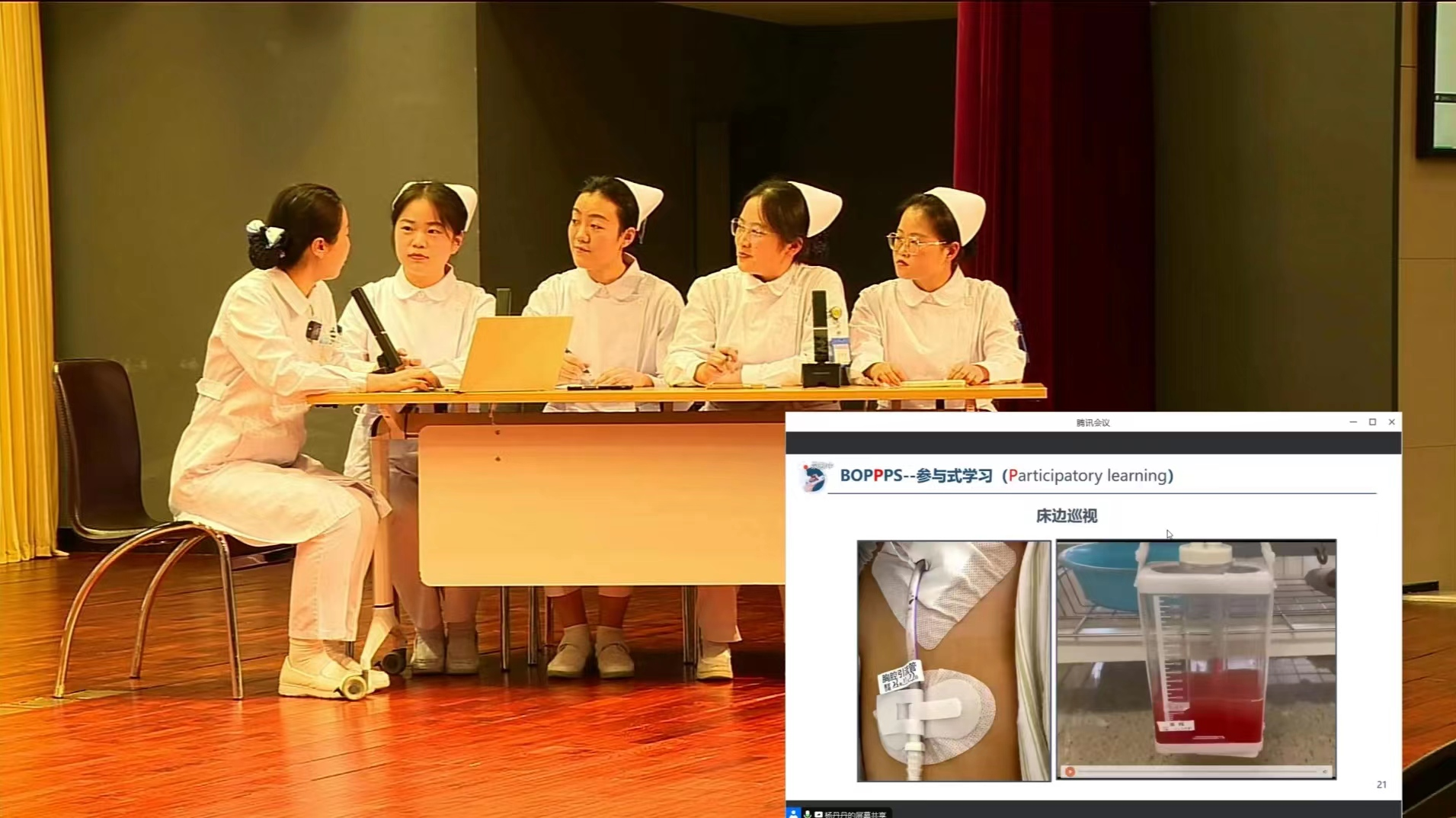 业精于勤,行成于思。总带教张筱童老师以学生为主体,采用PPT、教学道具和现场互动等形式进行相关知识讲解,通过启发式提问,疑难解答等,引导学生逐步深入了解相关知识,学生汇报病情,针对该病种提出三个模拟场景。通过推演问答和评估,进行实战演练和讨论。整个查房过程,同学们主动参与到教学活动,现场气氛活跃,精彩纷呈,不仅增加教学趣味性,使教学内容入心,入脑,也让枯燥的护理知识变得生动有趣。
