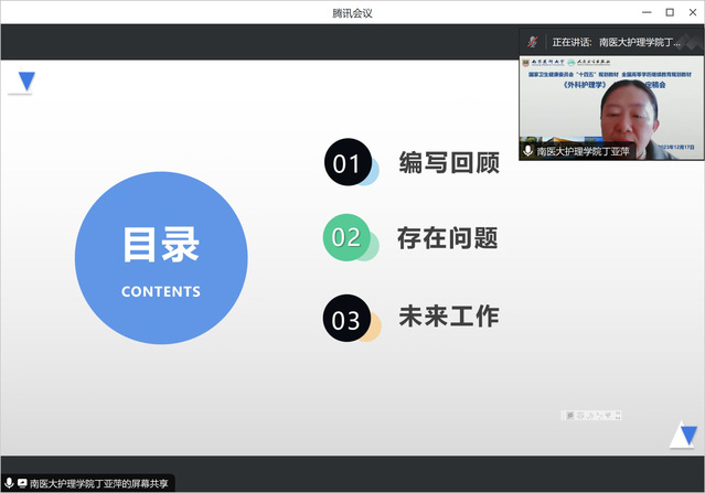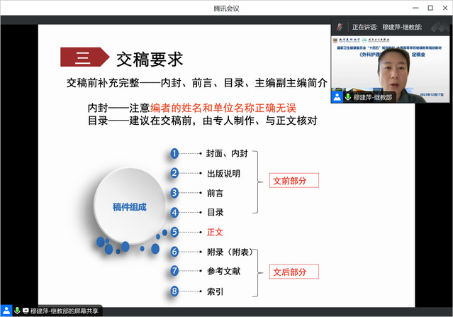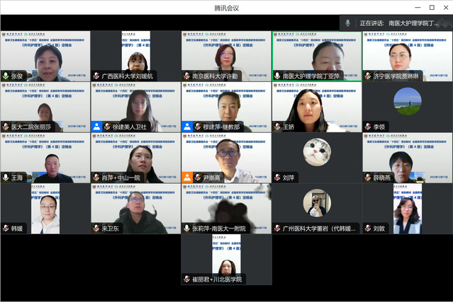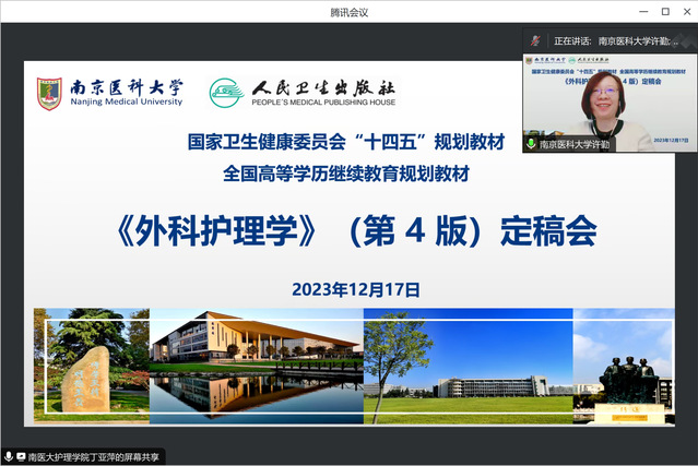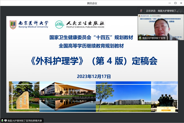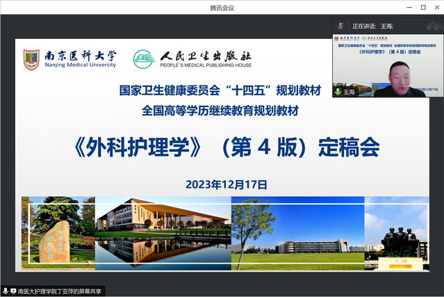 2023年12月17日,由南京医科大学护理学院丁亚萍副院长和山东第二医科大学MK体育(中国)尹崇高副院长共同担任主编,人民卫生出版社国家卫生健康委员会“十四五”规划教材、全国高等学历继续教育规划教材《外科护理学(第4版)》定稿会在线顺利召开。人民卫生出版社穆建萍编辑、徐建美编辑,南京医科大学继续教育学院王海院长,MK体育(中国)许勤院长,以及来自全国18所医学院校的20名编委参加会议。会议由丁亚萍主编主持。