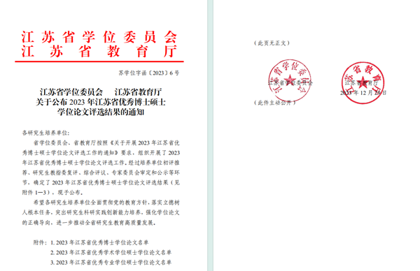 近日,江苏省学位委员会、江苏省教育厅发布《关于公布2023年江苏省优秀博士硕士学位论文评选结果的通知》(苏学位字函〔2023〕6号)。