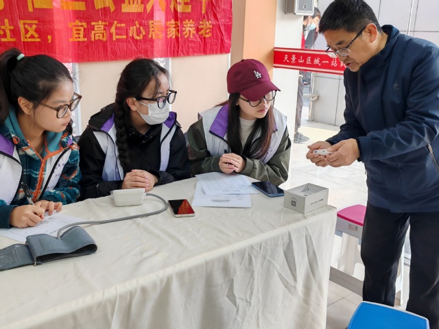 在方山社区一站式服务大厅里,一场特别的健康检测活动正在紧锣密鼓地准备中。志愿者们分工有序,各自展开测量和记录的工作。他们有的负责引导居民们排队等候,有的负责操作仪器进行测量,还有的负责记录测量结果。在同学们的指引下,居民们相继完成血压、血糖以及心率的测量。