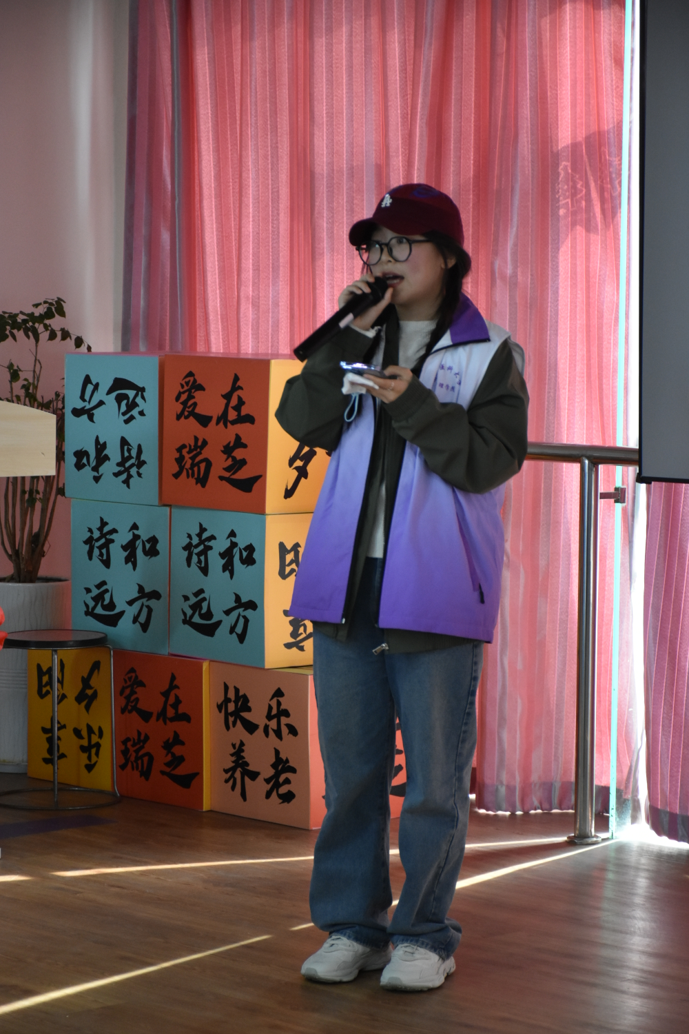 台上,一名志愿者深情地朗诵着经典诗歌《致橡树》。同时,志愿者还为老人们解读了玫瑰、百合等常见花朵的花语,让他们更加深入地感受到花朵背后的美好寓意。