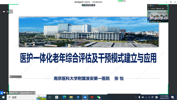 随后,张怡科护士长作“医护一体化老年综合评估及干预模式建立与应用”的专题汇报,她详细阐述了附属淮安第一医院医护一体化开展老年综合评估工作的创新实践,全面展示了医院在门诊、病房、延续护理患者中实施老年综合评估及干预所取得的成效。