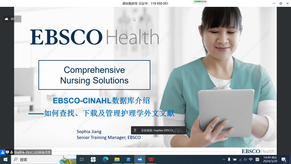 接着,EBSCO资深培训师蒋哲针对“EBSCO-CINAHL数据库介绍--如何查找、下载及管理护理学外文文献”作专题授课。她详细地演示了该数据库的操作步骤、检索策略、支持网站,帮助护理人员快速、轻松地学习外文文献,不断提升科研能力与水平。