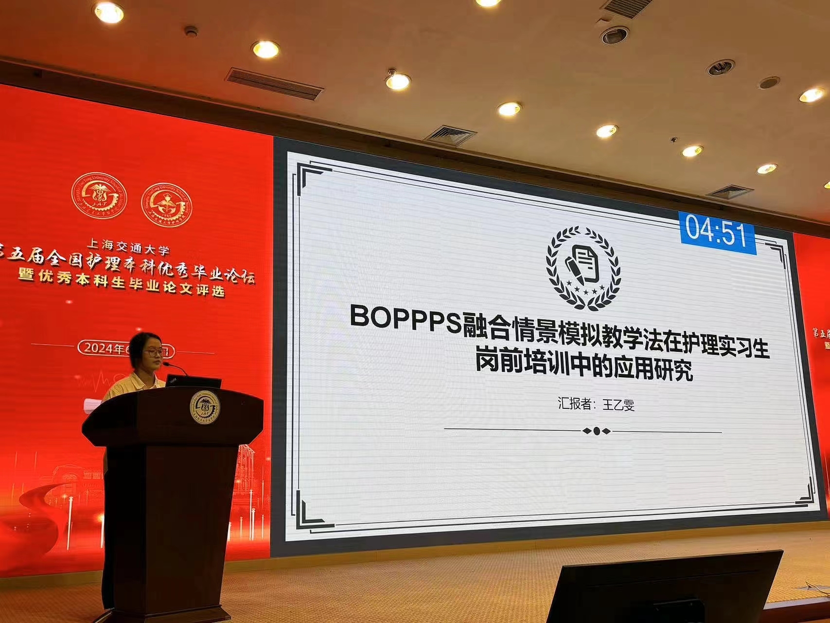 本次论坛共收到全国33所高校选送的本科生毕业论文,经过专家初审共有20名本科生入围论坛口头汇报,20名本科生入围壁报展示。我院王乙雯同学参加口头汇报,题为《BOPPPS融合情景模拟教学法在护理实习生岗前培训中的应用研究》。