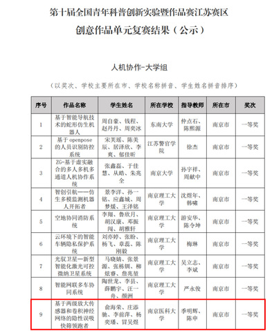 5月26日下午,第十届全国青年科普创新实验暨作品大赛江苏赛区创意作品单元颁奖仪式在南京市雨花台中学举行。我院季明辉、陈申老师指导,俞海荣、庄添驰、李前萍、杨奕璠、冒吴煜五位同学共同参与的创意作品《基于两级放大传感器和卷积神经网络的隐性误吸快筛领跑者》在大赛中脱颖而出,荣获大学组“一等奖”。这是我院师生连续两年荣获此赛事一等奖。