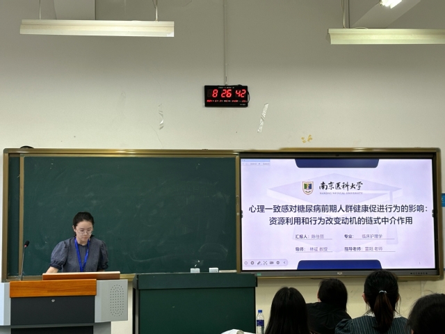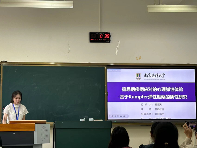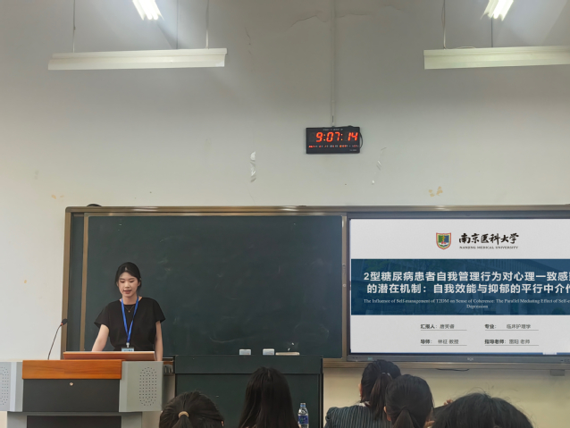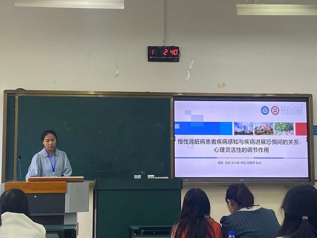 2021级博士研究生谌璐,2022级硕士研究生陈佳丽、程涵天、宋丹妮,2023级硕士研究生唐笑睿、李卓玲分别就“慢性肾脏病患者疾病感知与疾病进展恐惧的关系:心理灵活性的调节作用”“心理一致感对糖尿病前期人群健康促进行为的影响:资源利用和行为改变动机的链式中介作用”“基于Kumpfer弹性框架糖尿病患者疾病应对中心理弹性体验的质性研究”“辅助生殖受孕孕妇心理症状群异质性轨迹及其影响因素研究”“2型糖尿病患者自我管理行为对心理一致感影响的潜在机制:自我效能与抑郁的平行中介作用”“基于ABC-X模型老年肿瘤患者家庭照护者负性情绪的影响因素及提升路径分析”进行口头报告。2022级硕士研究生陈一萌、2023级硕士研究生唐笑睿分别进行题为《萨提亚家庭治疗模式在护理领域中的应用进展》《糖尿病自我护理指数量表在汉化及信效度检验》的壁报交流。