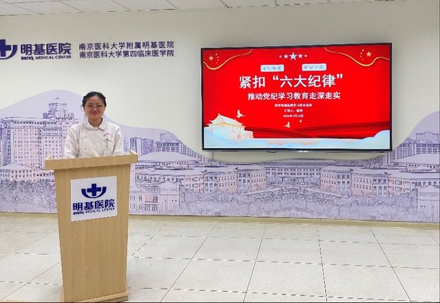 7月16日,南京医科大学附属明基医院护理部刘静主任,党支部书记熊兴林科护士长,实习班主任刘海霞老师从政治纪律、组织纪律、廉洁纪律、群众纪律、工作纪律、生活纪律六个方面进行教育分享,提出同学们需做到衷心向党、凝心聚力、公心用权、真心为民、尽心履职、清心正己。随后,预备党员高远和唐玥同学分别就党纪学习教育的内容和“六大纪律”进行了汇报,强调了学纪、知纪、明纪、守纪的重要性。