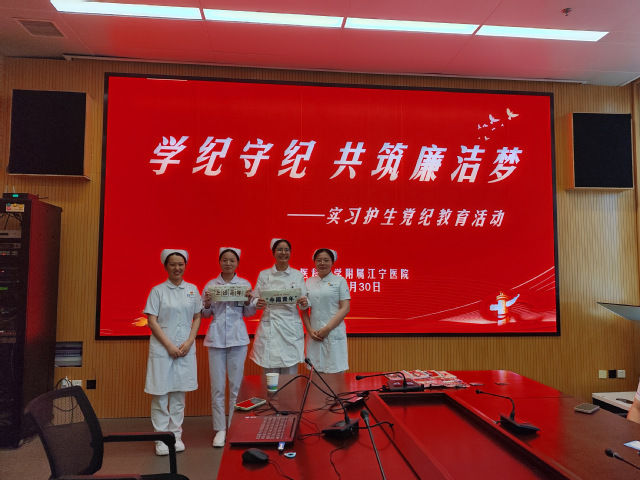 7月30日,南京医科大学附属江宁医院实习生聆听了护理部优秀党员王甜老师及张曦月老师作关于“党纪知识如何融入实习工作”与“实习期间如何保持廉洁自律”的团课。张梦婷和凌敏两位实习生在互动问答环节凭借出色的表现荣获“先进个人”称号,为所有实习同学树立了优秀榜样。
