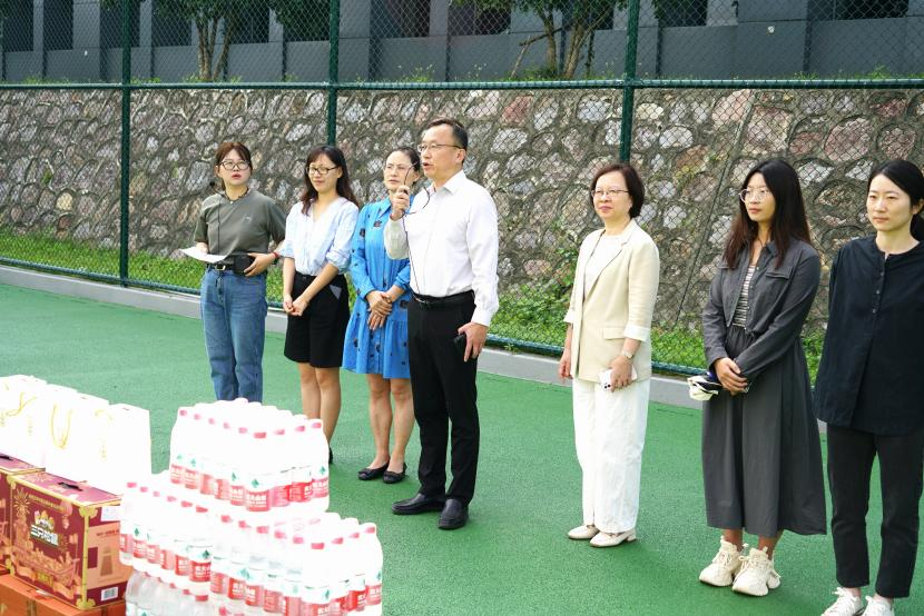 9月25日上午10点,MK体育(中国)党委书记马俊,MK体育(中国)院长许勤,副书记、副院长高兰天,学生工作办公室主任顾莹,辅导员刘一帆和各班兼职班主任们慰问2024级军训新生及承训教官。