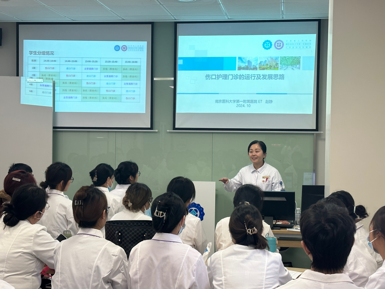 《高级护理实践》课程教学团队于2024年10月11日及18日分别在南京医科大学第一附属医院伤口造口门诊及骨科病区进行了临床实践教学活动,临床带教老师刘梅主任、赵静护士长、方曙静护士长、王广玲护士长、胡馨予老师、许静老师、李晶晶老师、李婷老师、课程助教朱涵菲老师及专硕研究生等60余人参加了此次实践教学活动。