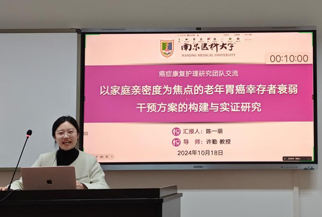 陈一萌同学在癌症康复护理研究团队课题成果展示主题报告中做题为《以家庭亲密度为焦点的老年胃癌幸存者衰弱干预方案的构建与实证研究》的汇报,研究基于团队前期基础,聚焦衰弱模拟干预分析所提示的关键靶点“家庭亲密度”,在萨提亚家庭治疗模式的指导下构建干预方案以改善衰弱,可进一步深入挖掘家庭对老年胃癌幸存者衰弱影响的潜力,从家庭视角出发,为开展老年衰弱人群临床实践研究提供新思路。