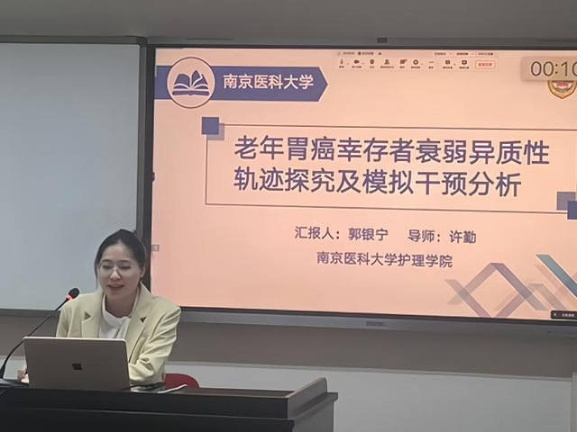 郭银宁同学在癌症康复护理研究团队课题成果展示主题报告中做题为《老年胃癌幸存者衰弱异质性轨迹探究及模拟干预分析》的系列研究汇报,研究采用增长混合模型刻画了患者术后一年的衰弱轨迹,确定了异质性衰弱轨迹,并据此构建了预测老年胃癌幸存者衰弱异质性轨迹预测模型列线图,并基于G-formula进行模拟干预,确定了能最大程度降低衰弱异质性轨迹发生风险的最佳干预靶点组合,为后续干预方案设计及实施提供科学依据。