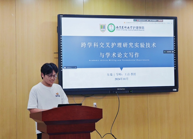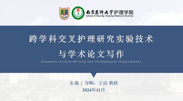 东瑞同学从研究设计、论文写作、基础实验三个方面介绍了基于跨学科交叉护理研究背景的实验技术和学术论文写作的相关知识和经验分享。他从作者和审稿人两个角度来阐述了研究设计的重要性,并以队列研究为例强调了论文写作应基于研究报告规范进行撰写。最后,他从实验类型、实验总体流程和注意事项进行了详细的介绍。