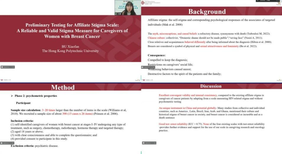 香港理工大学卜晓繁博士作题为《Preliminary Testing for Affiliate Stigma Scale: A Reliable and Valid Stigma Measure for Caregivers of Women with Breast Cancer》的汇报,该研究是针对乳腺癌照护者开发研制的连带病耻感量表测试。卜晓繁博士汇报了量表基于质性访谈生成量表条目和关联心理测量特性两个阶段的研制过程,初步验证了新开发的量表在临床和研究环境中评估乳腺癌照护者,提供了一种有效且可靠的工具。