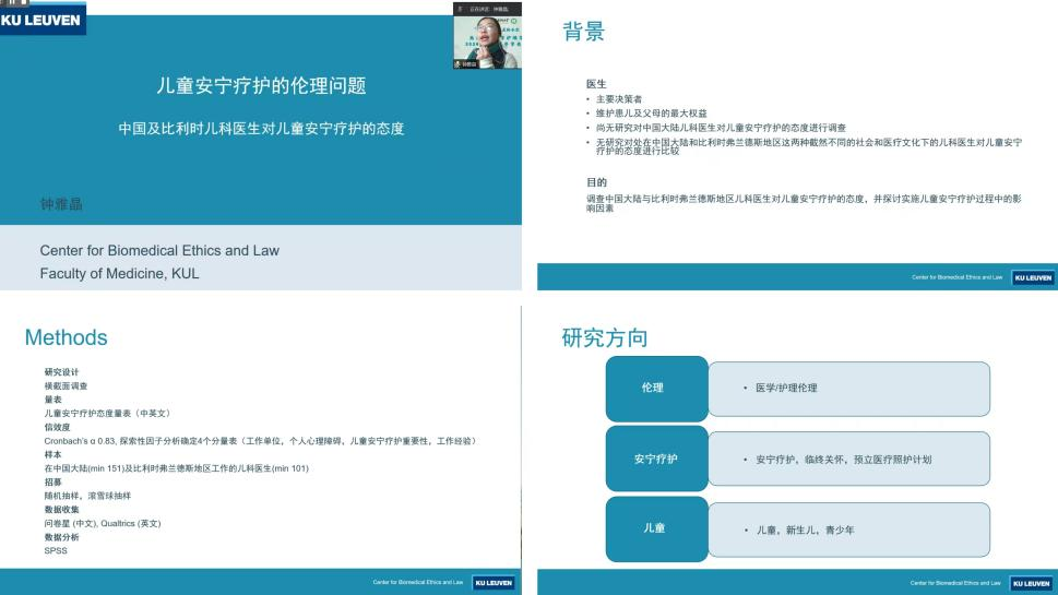 鲁汶大学钟雅晶博士作题为《The ethics in pediatric palliative care》的汇报,该汇报把中国与比利时儿科医生之间作视角对比,用横断面调查研究的方法揭示中国与比利时儿科医生对儿童安宁疗护的态度及影响因素。该研究发现两个国家的儿科医生都表示相关儿童安宁疗护的经验有限,其中比利时儿科医生在儿童安宁疗护方面能够得到更多工作单位的支持,该研究还发现照顾重症患儿和儿童安宁疗护的经验有可能会影响医生对儿童安宁疗护的态度。钟雅晶博士最后还表示未来会持续探索伦理、儿科、安宁疗护等相关方向。