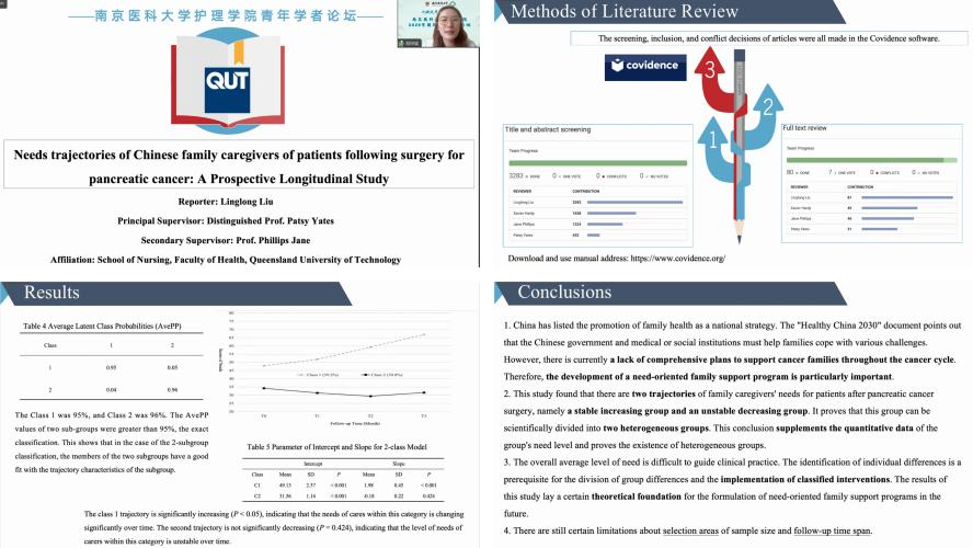 昆士兰科技大学刘玲珑博士作题为《Needs trajectories of family caregivers of patients following surgery for pancreatic cancer: A Prospective Longitudinal Study》的汇报。该研究揭示了胰腺癌术后患者家庭照顾者在不同阶段需求的特点,以及随时间进展产生的变化趋势。刘玲珑博士在对该项研究的阶段性成果汇报的同时,还分享了研究过程中遇到的挑战及应对经验。