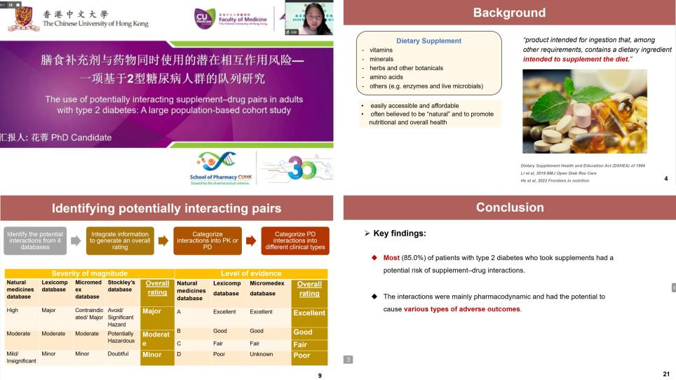 香港中文大学花蓉博士作题为《The use of potentially interacting supplement–drug pairs in adults with type 2 diabetes: A large population-based cohort study》的汇报,该研究采用队列研究的方法,探索2型糖尿病人群同时使用膳食补充剂与药物的潜在相互作用风险,研究以新发的肝脏疾病、出血事件以及低血压事件作为结局变量,发现研究对象同时使用膳食补充剂与药物具有潜在相互作用风险的高达85%,其中鱼油这一类产品跟阿司匹林的同时使用会增加出血的风险。