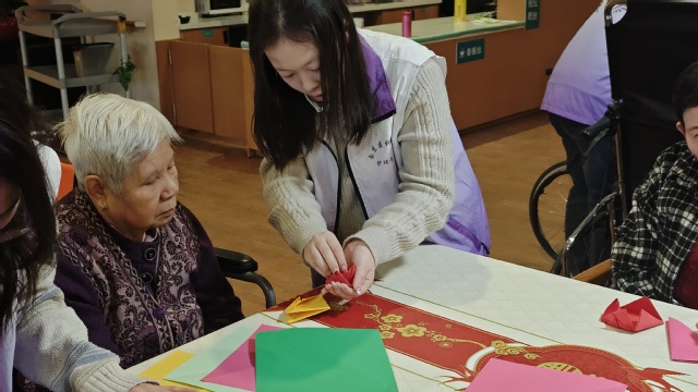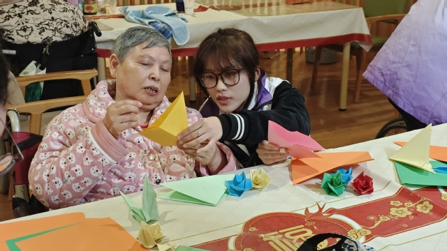 2月22日,12名志愿者走进银轩康养养老院,开展趣味折纸活动。老人们与志愿者一同折叠彩纸,创作出缤纷的花束与千纸鹤。活动中,一位九旬奶奶分享了她年轻时学习多国语言的青春故事,引得大家连连赞叹。