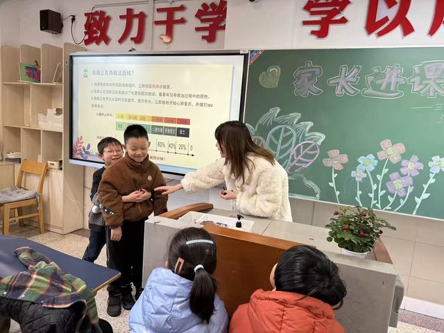 针对小学生常见的流鼻血问题,志愿者通过趣味短片和口诀教学,科普正确的处理步骤:“低头捏鼻勿后仰,冷敷止血莫慌张”。为加深记忆,宣讲成员设计了“急救小剧场”,由学生扮演施救者与伤者,进行实操演练。活动中,学生们踊跃参与,不少人在志愿者指导下成功完成操作,收获了阵阵掌声。