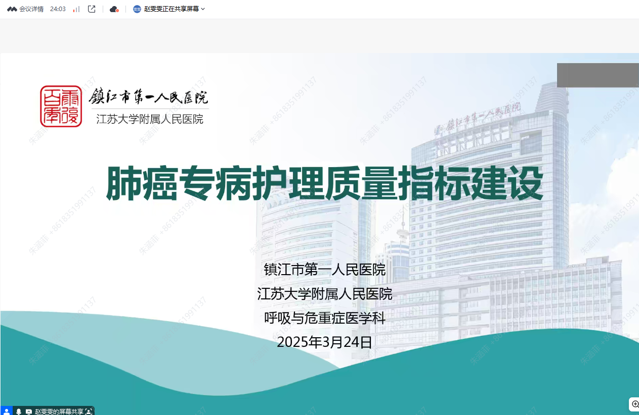 镇江临床医学院副主任护师赵雯雯担任主讲人,她是江苏省呼吸内科护理专业委员会委员、江苏省危重症专科护士,现任镇江临床医学院呼吸科二病区护士长,深耕呼吸系统疾病护理领域多年,在临床护理管理与质量提升方面积累了丰富经验。本次交流中,她围绕肺癌疾病护理质量指标的科学构建、规范化实施及效果评价展开深度解析,结合临床案例分享最新护理理念与实践路径,为护理工作者提供切实可行的指导方案,旨在通过经验分享,提升护理队伍的专业能力与实践水平。