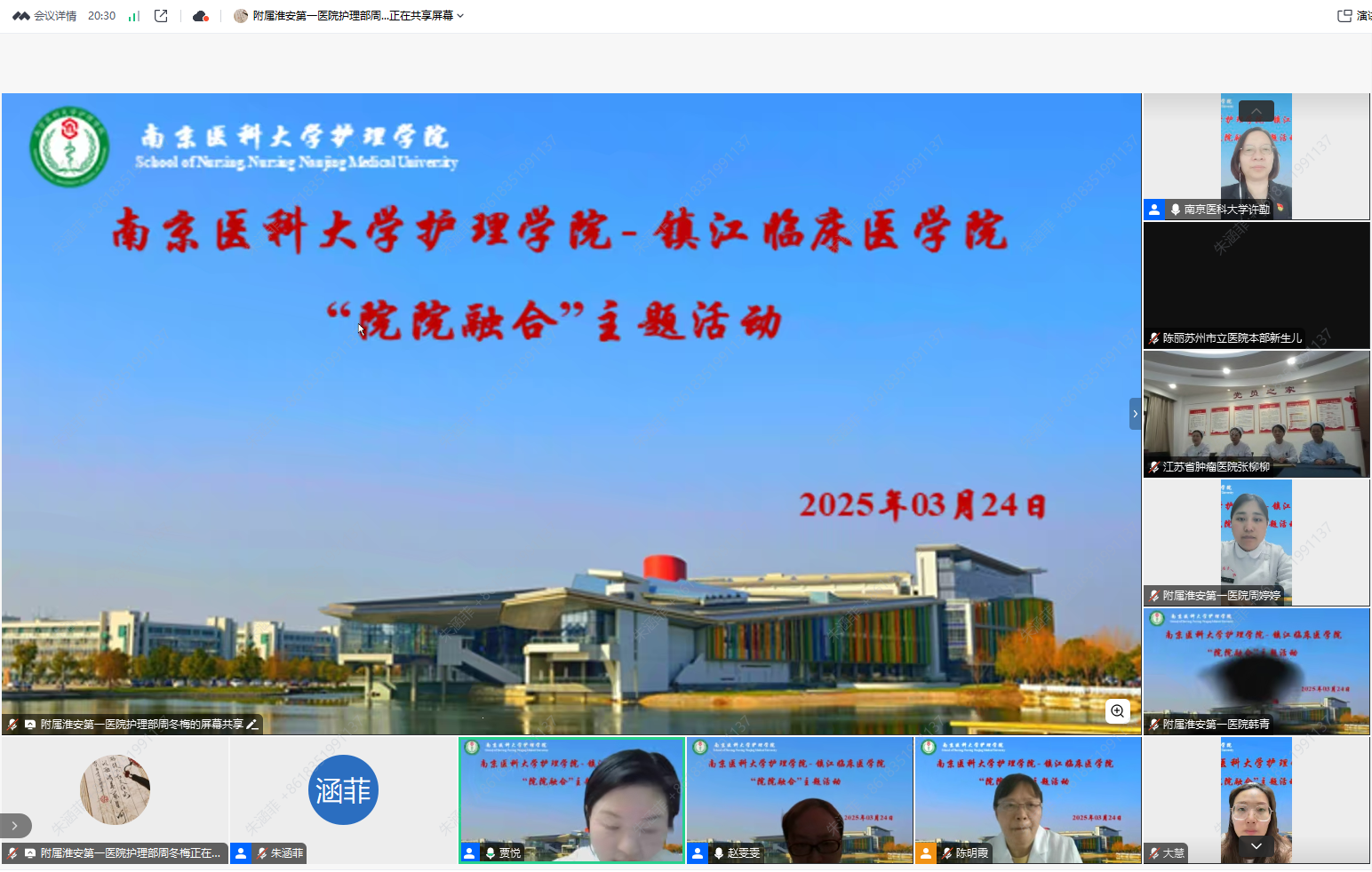 为加强学院与附院全方位合作和交流,充分发挥自身优势,进一步推进护理学科建设和发展,MK体育(中国)与镇江临床医学院于2025年3月24日联合举办“院院融合”线上主题活动。MK体育(中国)院长许勤、临床护理学系主任陈明霞,以及各临床护理教研室的护理管理人员、临床护理骨干、教学骨干等近百人参与了本次活动。