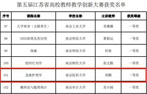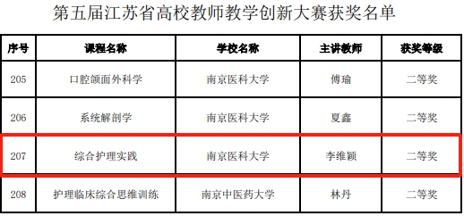 近日,第五届江苏省高校教师教学创新大赛评审结果揭晓,郑鹏老师(课程《急救护理学》)荣获一等奖,李维颖老师(课程《综合护理实践》)荣获二等奖。此次大赛全省共有79所高校610项作品参赛,竞争激烈,两位老师在众多参赛选手中脱颖而出,取得佳绩。