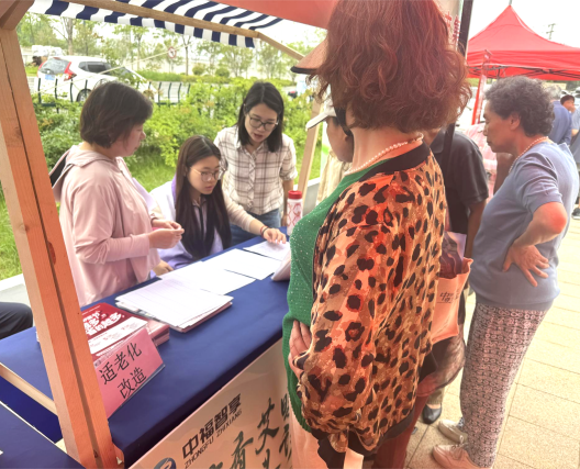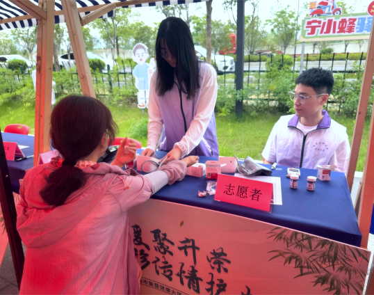 活动分为健康义诊和端午互动两大板块。在健康服务区,志愿者们为老人提供血压、血糖测量等基础护理服务,并针对检测结果进行一对一健康指导。测量血压时,志愿者细致询问老人的日常用药和饮食作息,结合数据提出个性化建议;血糖检测环节,志愿者耐心安抚老人情绪,科普血糖管理知识,提醒注意饮食平衡与定期监测。