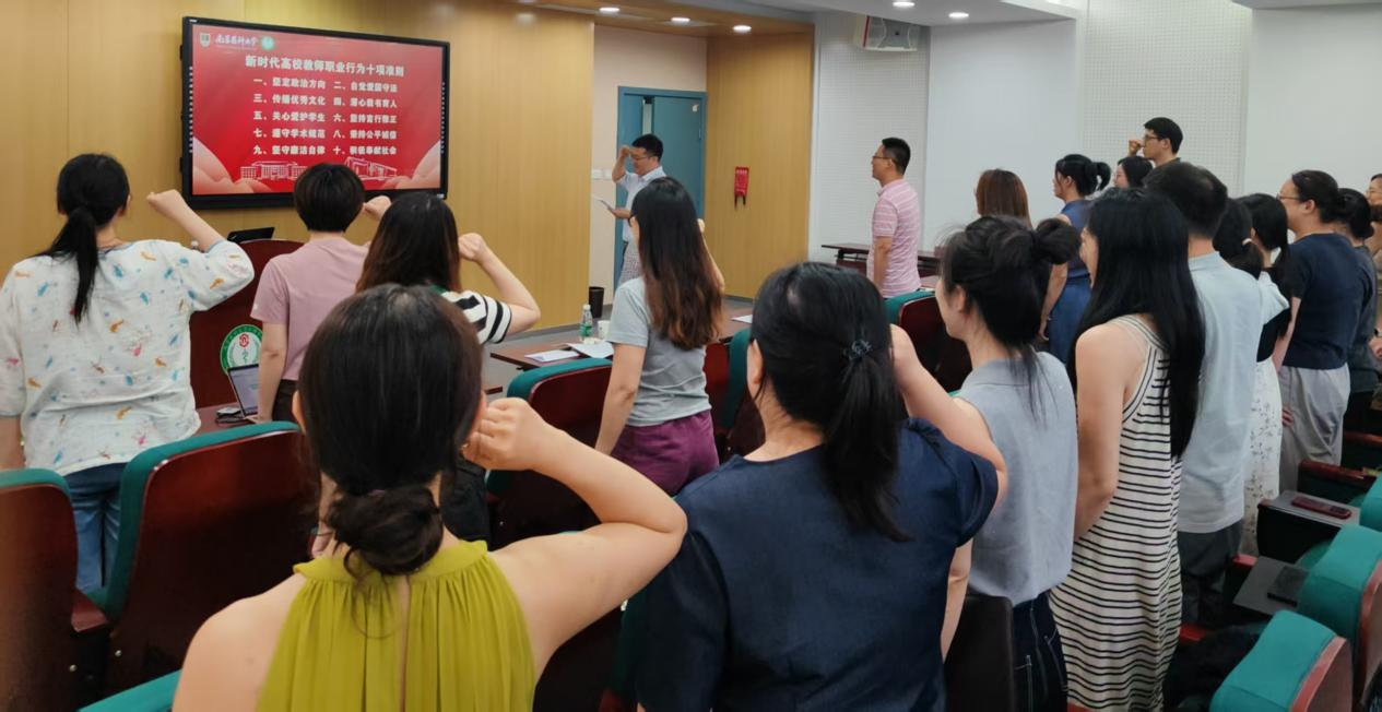 活动开场,在领誓人李现文主任的带领下,30余名青年教师全体起立。他们庄严地举起右拳,以新时代高校教师职业行为准则为宣言,齐声发出铿锵誓言。一句句掷地有声的承诺,不仅是对高尚师德师风的郑重宣誓,更是他们将全身心奉献于教育教学工作的铿锵决心。