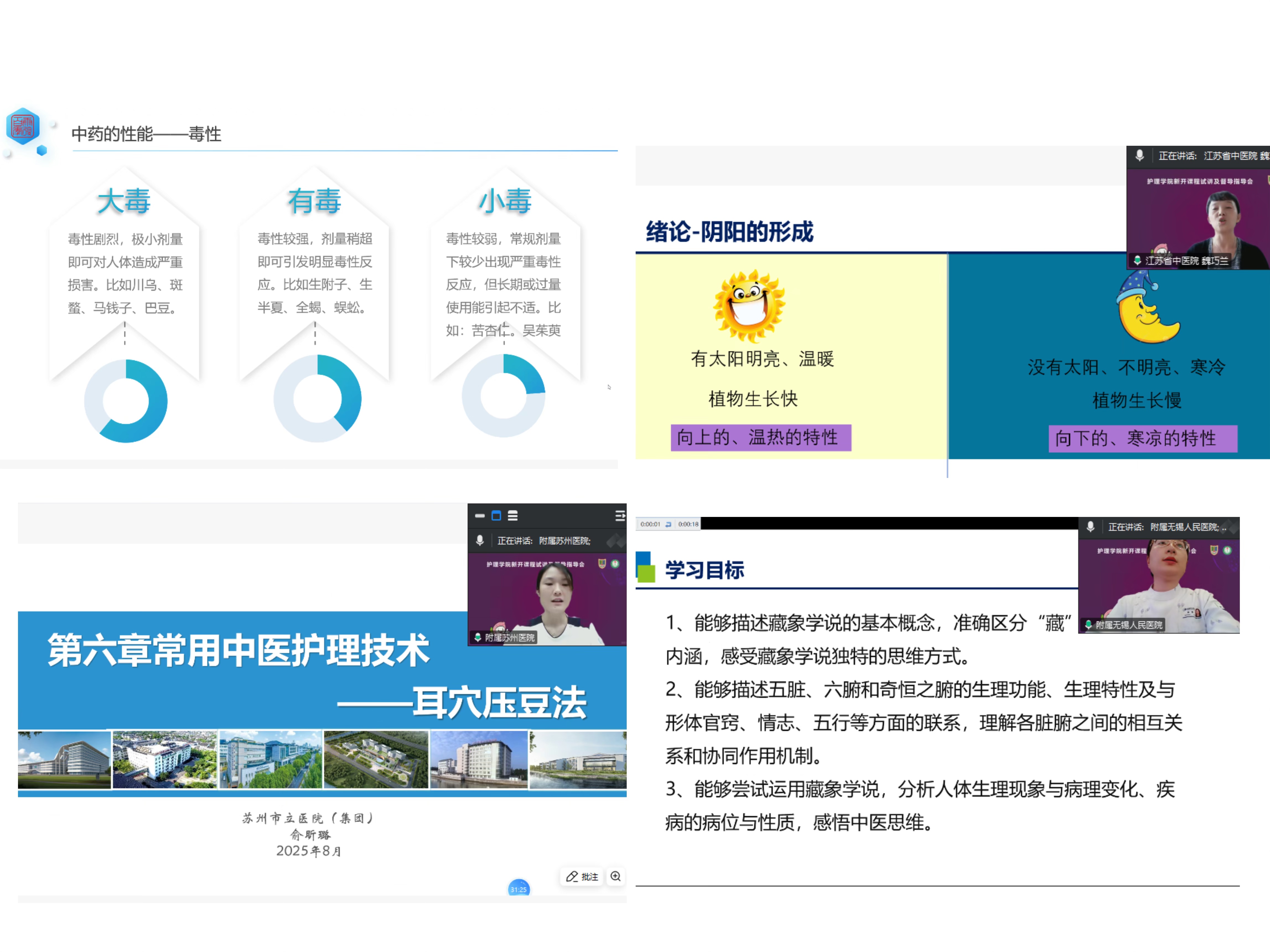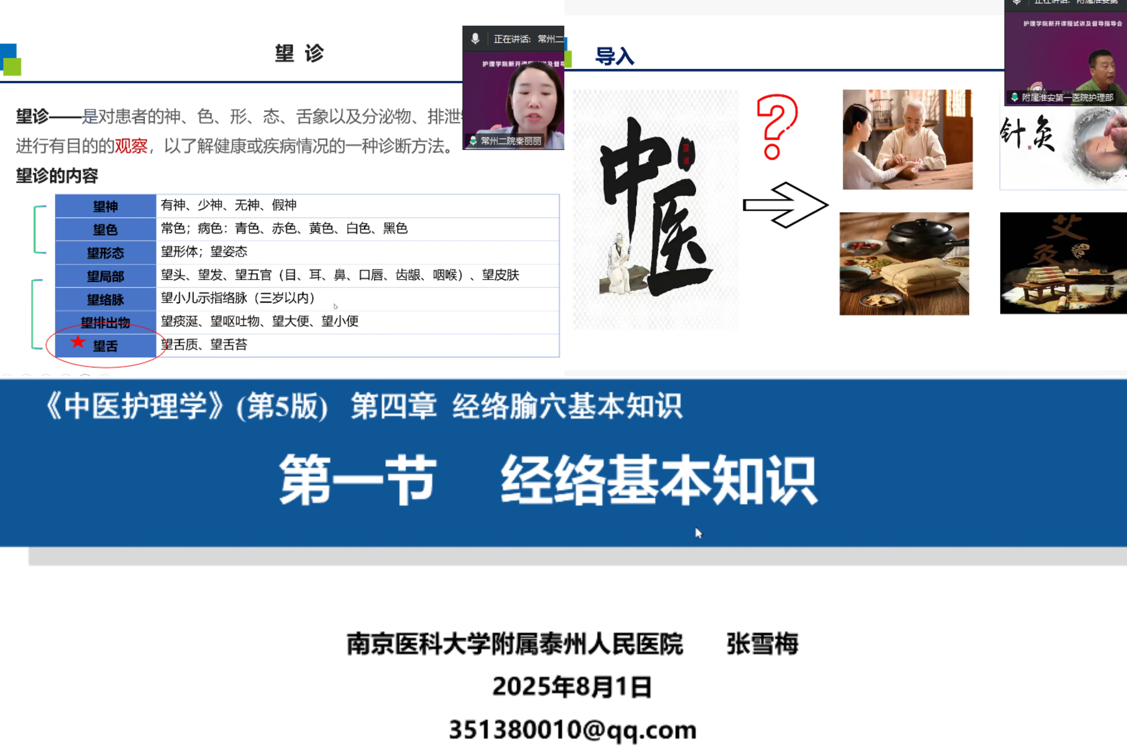 《中医护理学》总负责人汪璐老师详细介绍课程设计理念与教学目标。随后,校本部及来自宁外6家驻点教学基地的7位课程主讲教师,依次进行精彩试讲。试讲内容不仅涵盖中医基础理论、临床护理应用等专业知识,还融入思政融合案例,让课程内容更具深度与温度。例如,魏巧兰老师讲解“绪论-阴阳的形成”,生动阐释阴阳特性;俞昕璐老师聚焦“第六章常用中医护理技术-耳穴压豆法”,详细介绍该技术操作要点;李谨老师明确藏象学说的学习目标,并运用该学说分析生理与病理现象;苏英老师系统讲解望诊内容,包括望神、望色、望形态等多个方面;张雪梅老师则围绕《中医护理学》(第5版)中“第四章经络腧穴基本知识”展开讲解;赵晓峰老师以针灸等内容为切入点进行课程导入。
