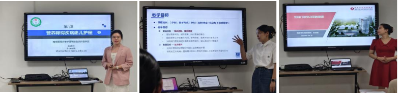 接下来,由学院教师朱涵菲、任子淇,第一附属医院汤婷、杨洁凤,第一附属医院龙江院区姜涛、王双、叶敏分别进行《儿科护理学》《内科护理学》《妇产科护理学》理论授课内容的试讲。评审专家嵇艳副院长指出,理论授课需激发学生兴趣注重与学生的自然互动,避免单纯提问式交流;孙国珍老师指出,PPT设计应简洁明了、重点突出,避免过多文字干扰讲课内容需有条理,可用时间线或思维导图构建框架,帮助学生理解;陈明霞老师指出注意语言组织,减少无意义讲解,提升表达准确度和层次感。此外,专家一致认为,新教师应多观摩资深教师的理论课堂,学习新的教学方法与互动形式,促进从以教师为中心到以学生为中心的教学理念转变,提升教学效果。