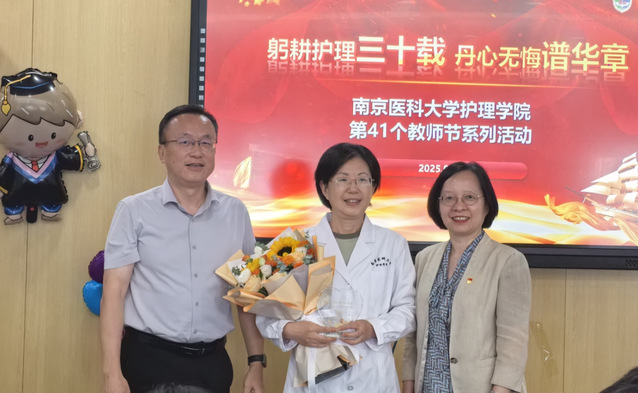 “仁心引路,薪火相传”环节,雷阳等五位青年教师朗诵《致并肩的我们》,“执着于护理诊断精准表述”、“科研数据反复验证”、“用初心唤醒初心,用热爱点燃热爱”等真挚语句,道出护理教师对职业的敬畏、对前辈的敬佩与对同行的感谢,深情诵读打动全场,掌声经久不息。