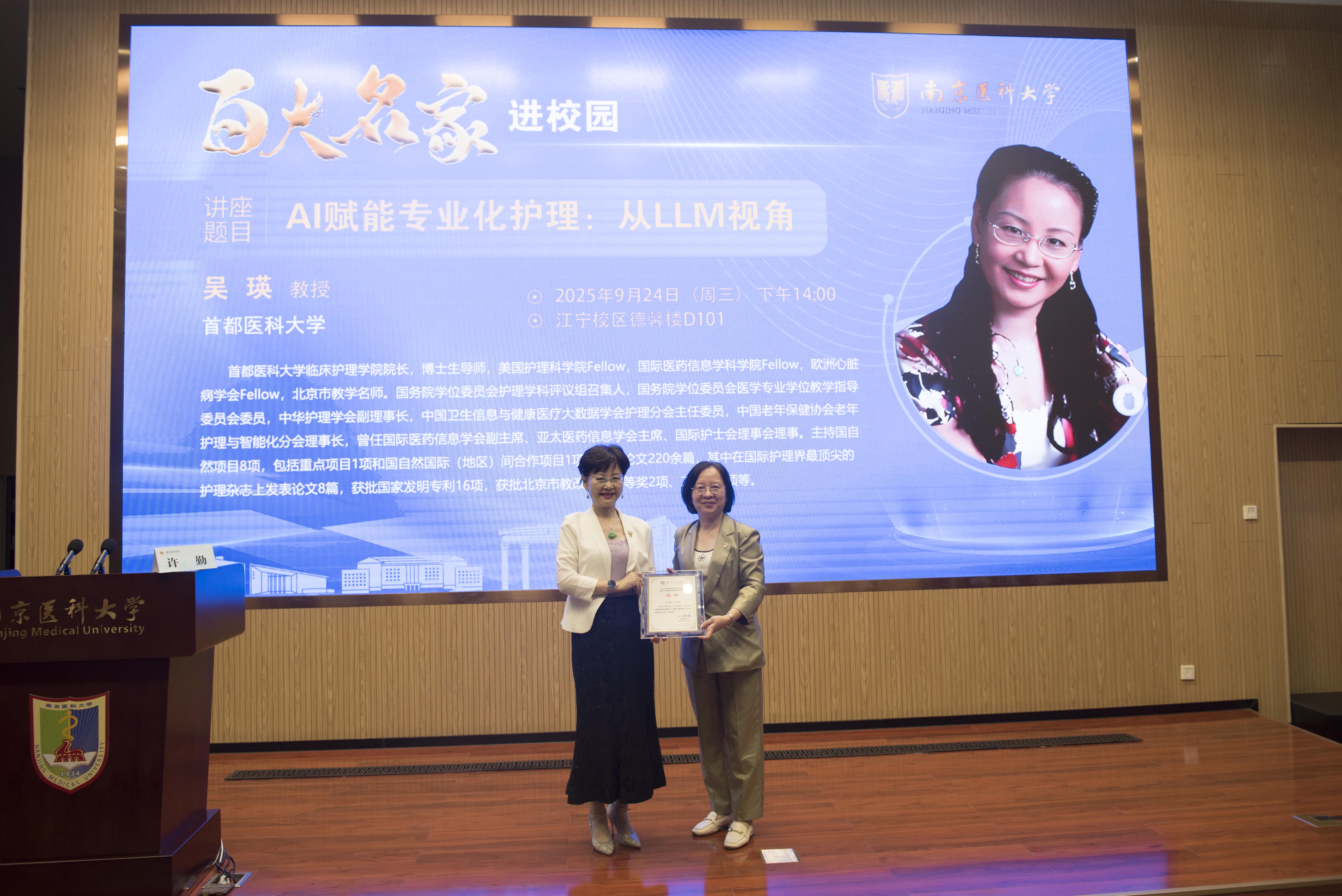 此次讲座为护理学科师生提供了前沿的AI应用视野。吴瑛教授以深厚的学术造诣和丰富的研究成果,系统阐释了人工智能赋能护理的技术路径与发展前景,为我院师生带来了一场高水平的学术盛宴。作为南京医科大学的优秀校友,她的到访不仅展示了人工智能与护理深度融合的学科前沿,也为推动我院护理学科的创新发展注入了新的启示与动力。